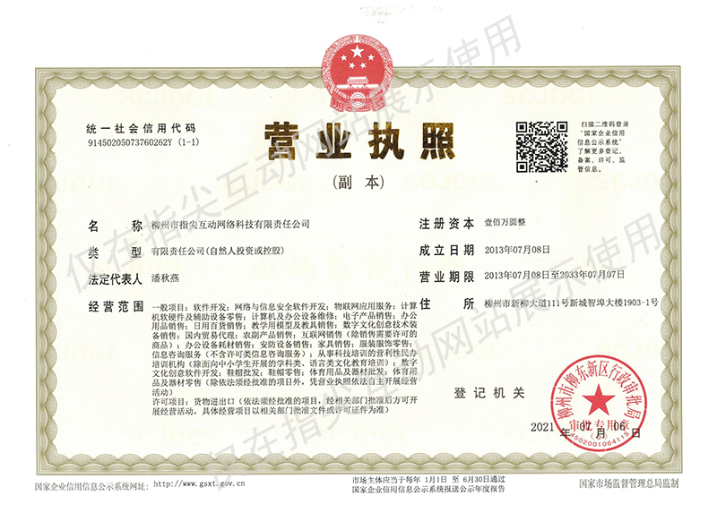 中國(guó)·柳州高新信息產(chǎn)業(yè)園 手機(jī):18978071114聯(lián)系電話(huà):400-885-0772 、0772-2529808地址:柳州市高新一路15號(hào)信息產(chǎn)業(yè)園A棟A2-20號(hào) 工商營(yíng)業(yè)執(zhí)照(副本)